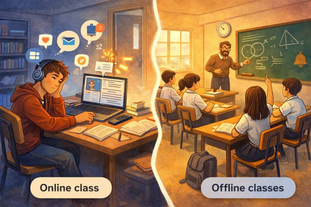 Online classes can provide information and explanations, but offline classes help students develop discipline, focus, and consistent study habits.